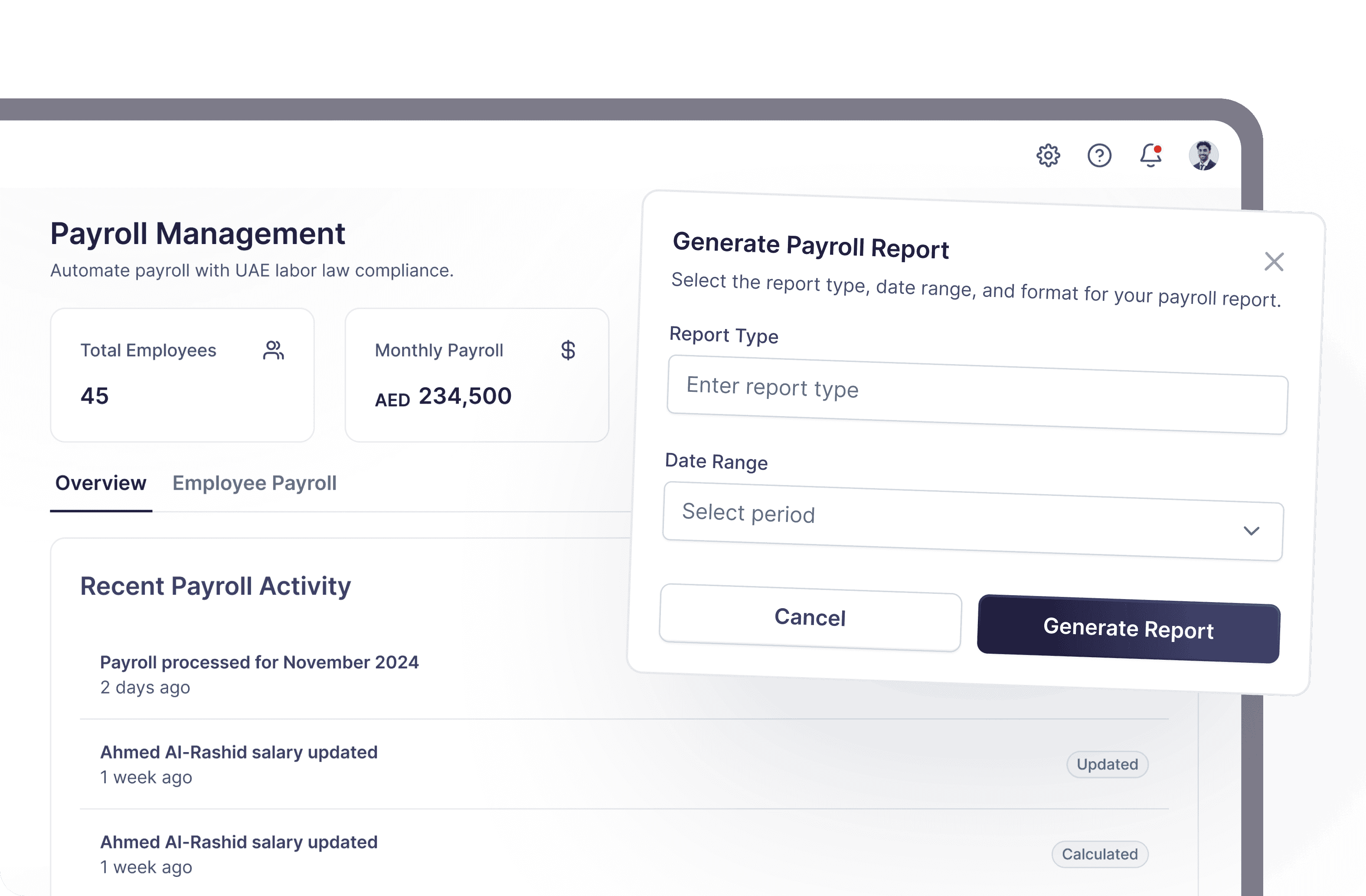Run payroll in the UAE & KSA with ease including automated salaries, WPS, payslips, and filings.